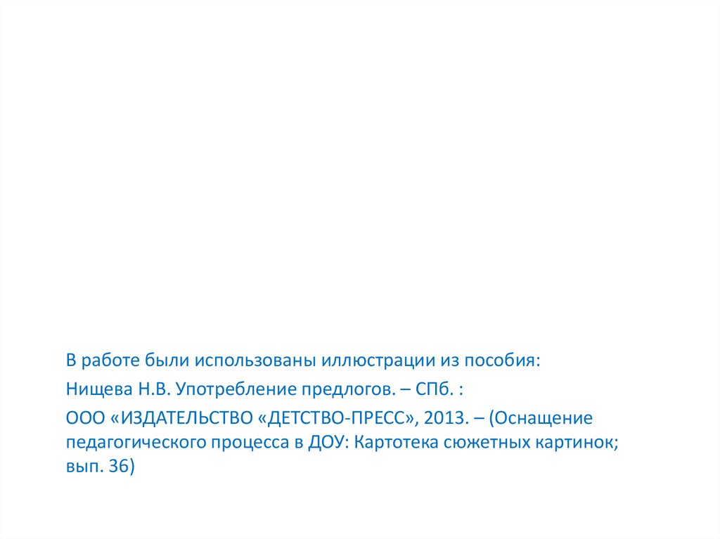 В работе были использованы иллюстрации из пособия:Нищева Н.В. Употребление предлогов. – СПб. :