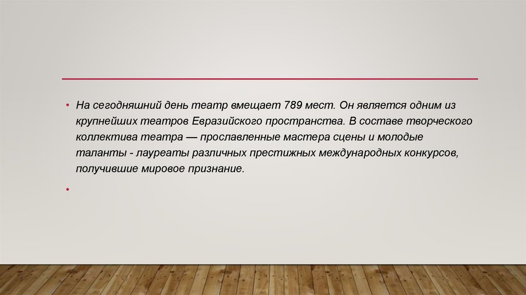 • На сегодняшний день театр вмещает 789 мест. Он является одним изкрупнейших театров Евразийского пространства. В составе творческого