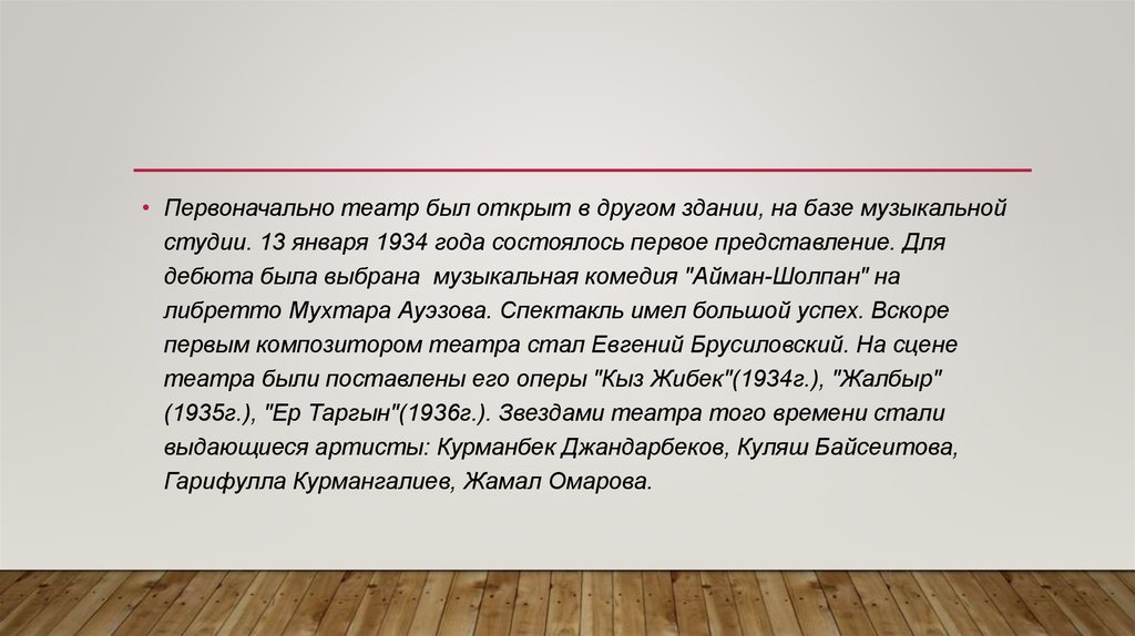 • Первоначально театр был открыт в другом здании, на базе музыкальнойстудии. 13 января 1934 года состоялось первое представление. Для