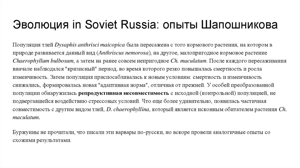 Эволюция in Soviet Russia: опыты ШапошниковаПопуляция тлей Dysaphis anthrisci maicopica была пересажена с того кормового растения, на котором в
