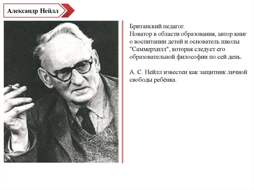 Нейл организовал собственную школу Саммерхилл - Летний холм, в которойприсутствие детей на занятиях было добровольным. Школа была основана на