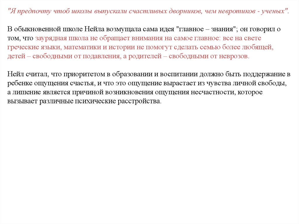 "Я предпочту чтоб школы выпускали счастливых дворников, чем невротиков - ученых".В обыкновенной школе Нейла возмущала сама идея "главное – знания"; он говорил о