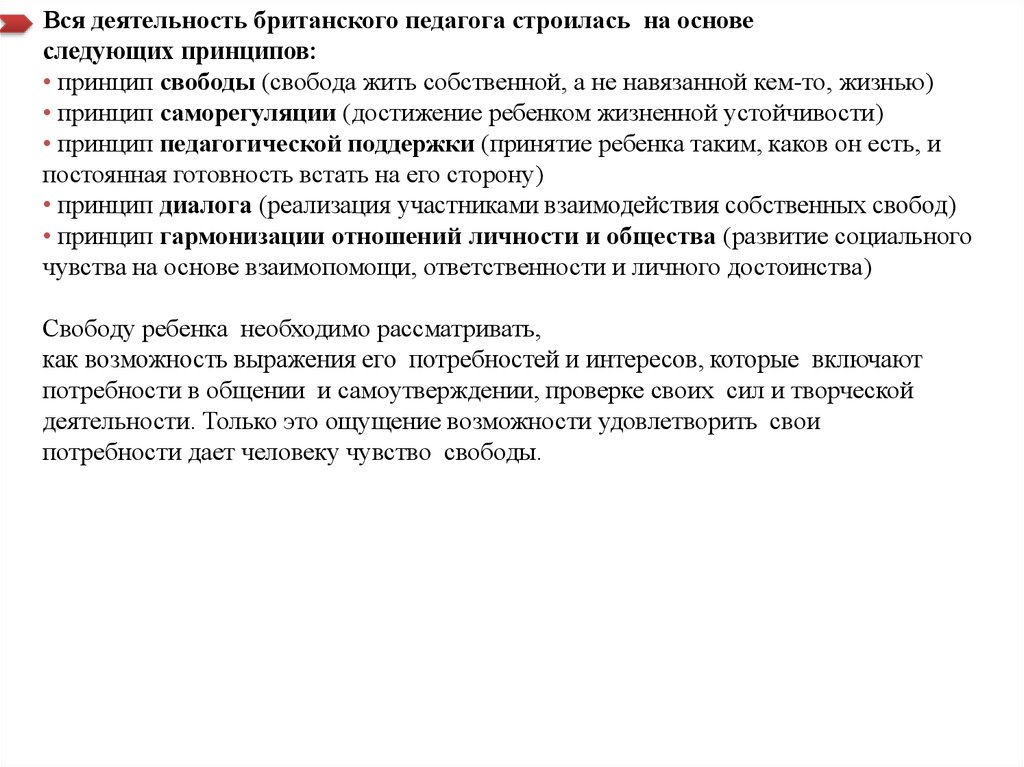 Вся деятельность британского педагога строилась на основеследующих принципов: