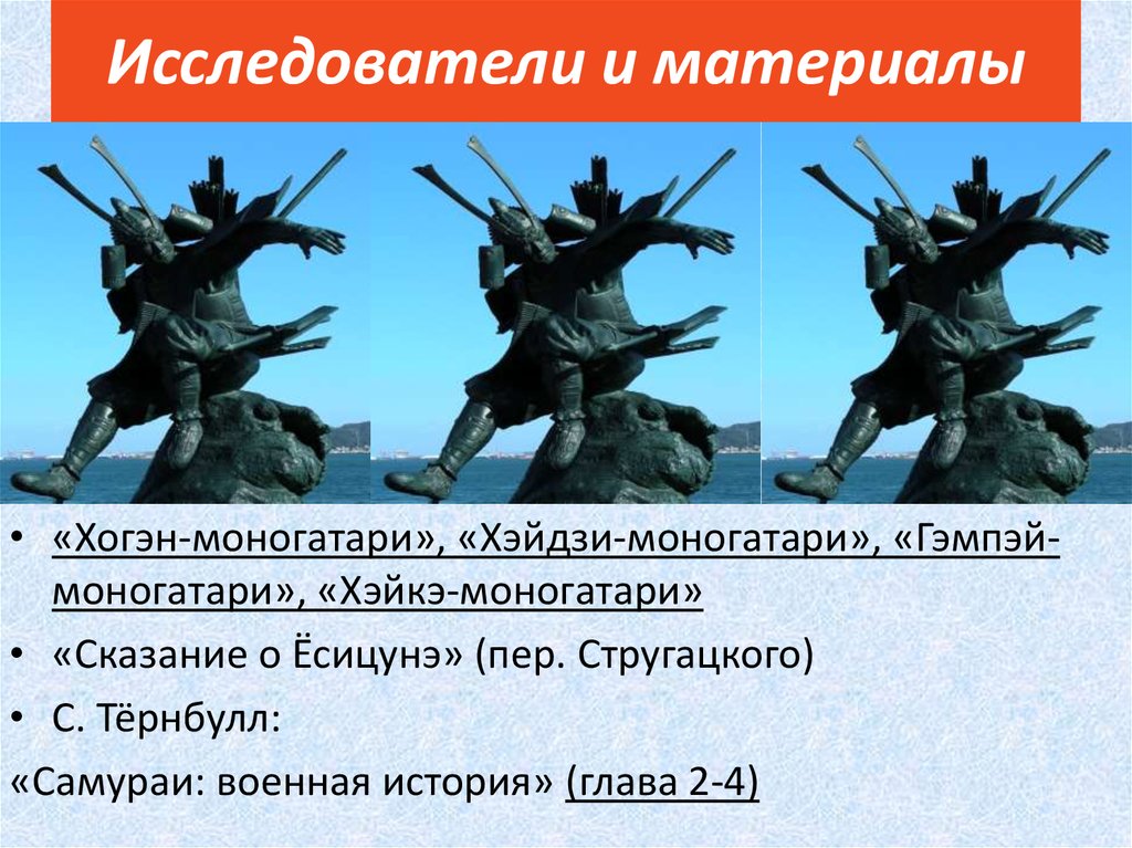 Исследователи и материалы• «Хогэн-моногатари», «Хэйдзи-моногатари», «Гэмпэймоногатари», «Хэйкэ-моногатари»