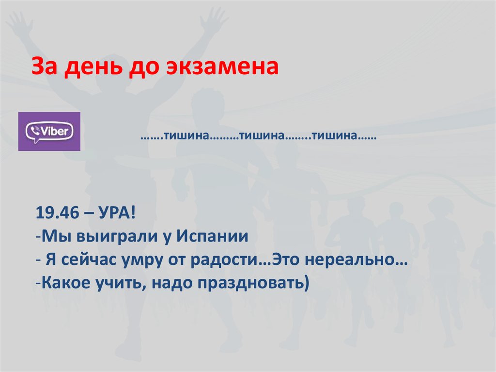 За день до экзамена…….тишина………тишина……..тишина……
