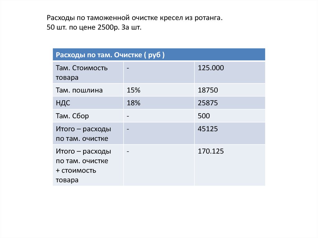 Расходы по таможенной очистке кресел из ротанга.50 шт. по цене 2500р. За шт.