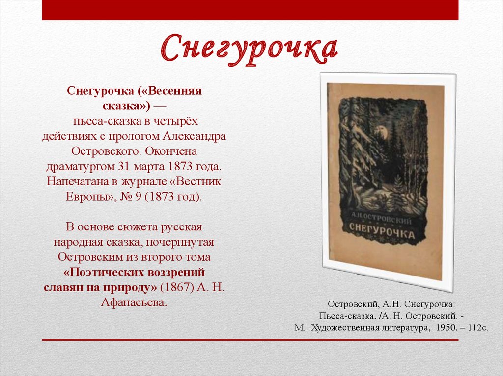Пьеса-сказка. /А. Н. Островский. М.: Художественная литература, 1950. – 112с.