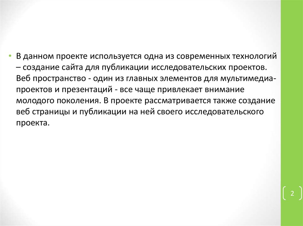 • В данном проекте используется одна из современных технологий– создание сайта для публикации исследовательских проектов.