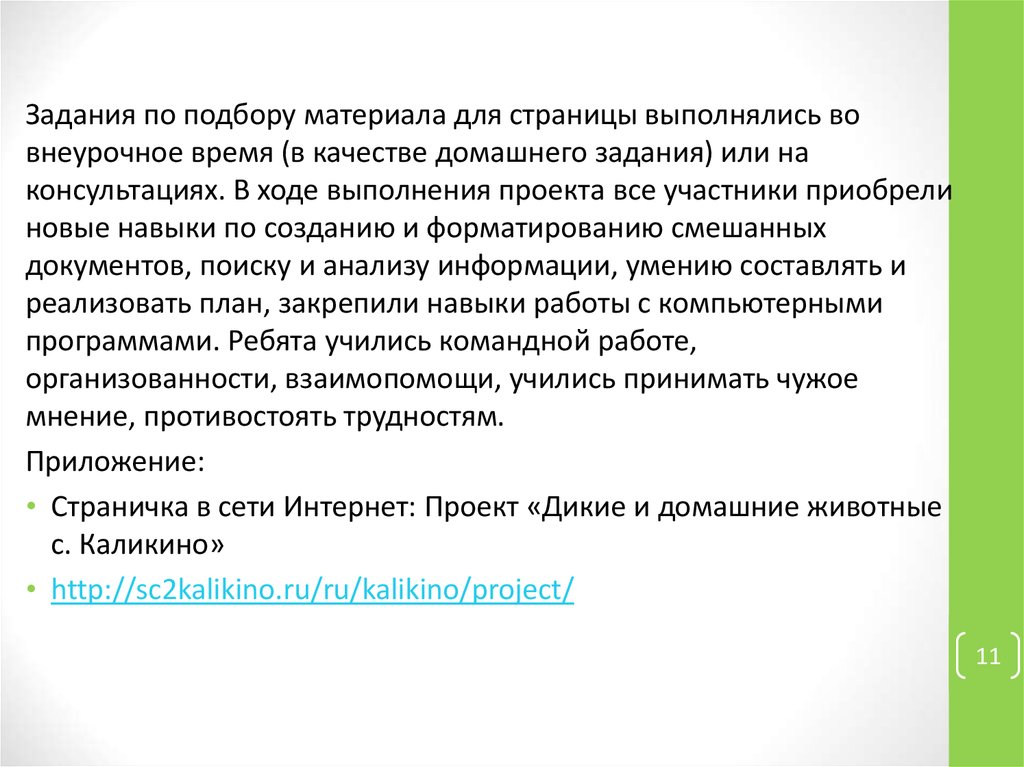 Задания по подбору материала для страницы выполнялись вовнеурочное время (в качестве домашнего задания) или на