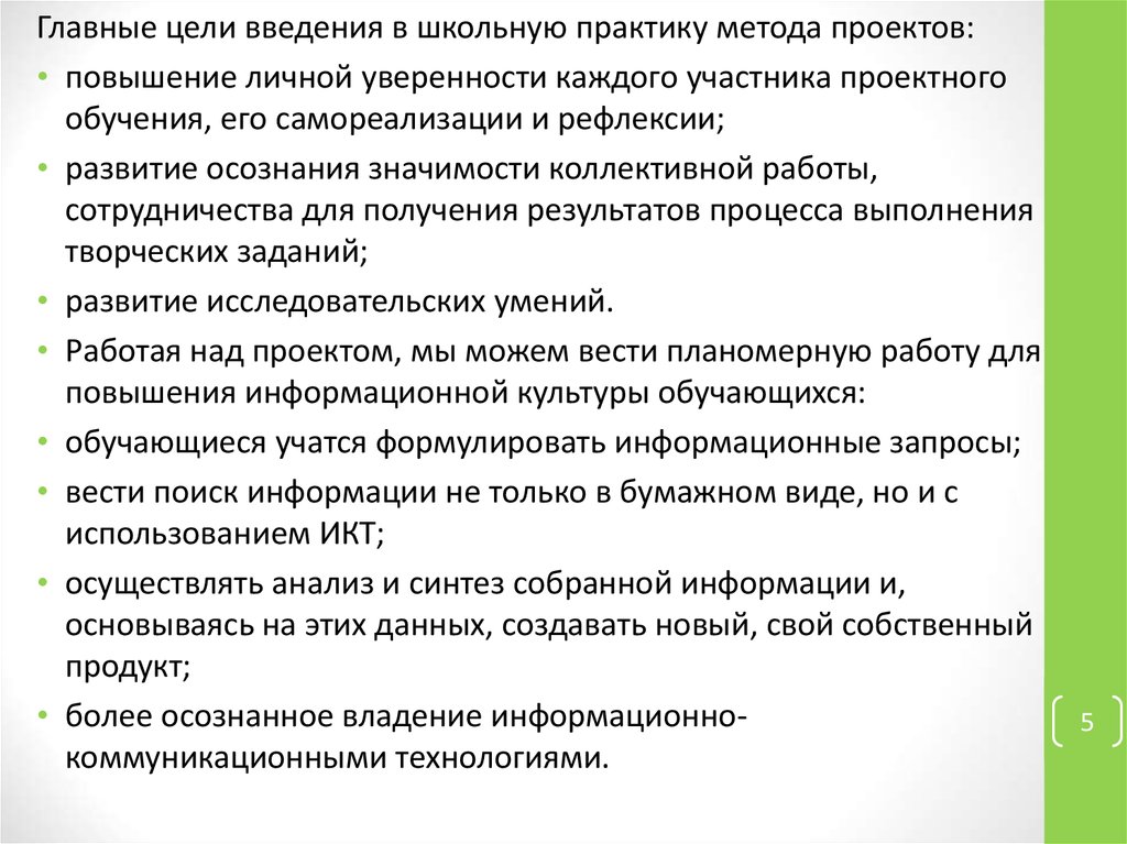 Главные цели введения в школьную практику метода проектов:• повышение личной уверенности каждого участника проектного