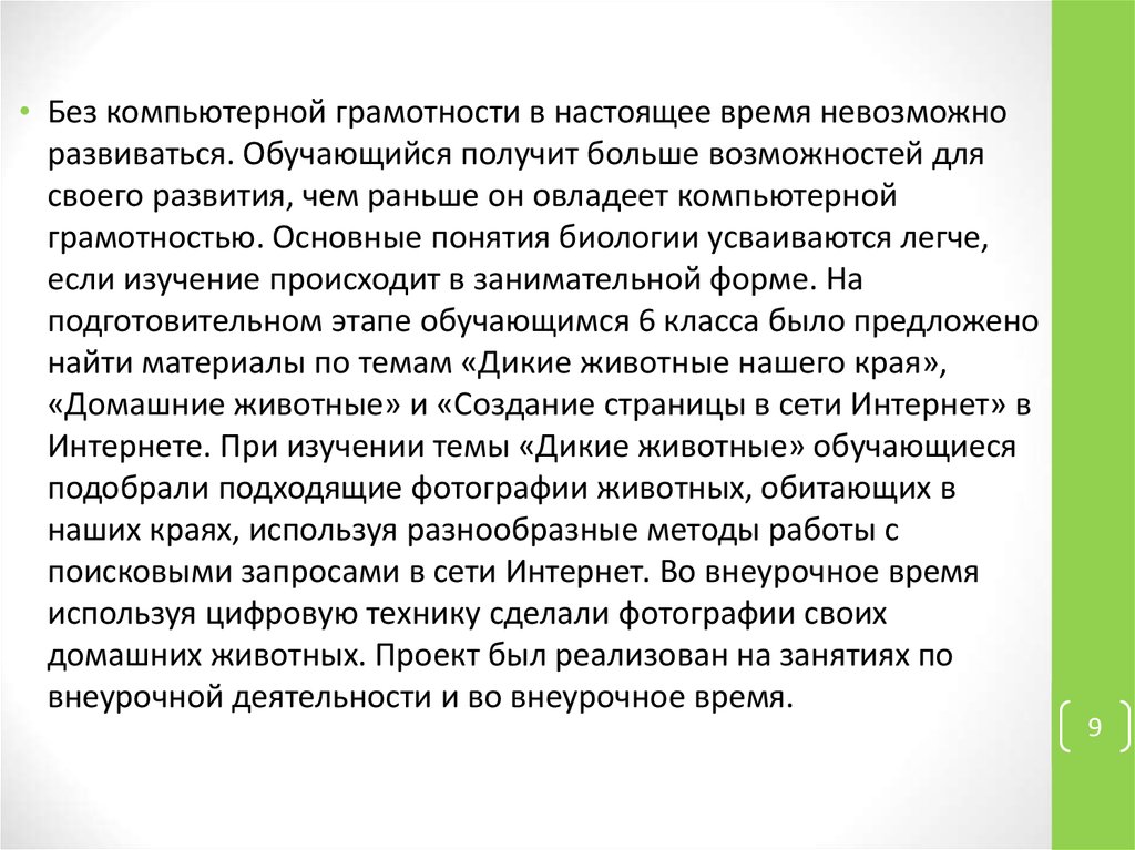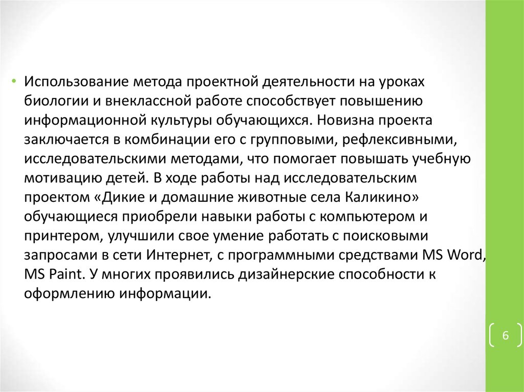 • Использование метода проектной деятельности на урокахбиологии и внеклассной работе способствует повышению