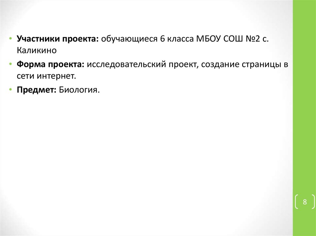 • Участники проекта: обучающиеся 6 класса МБОУ СОШ №2 с.Каликино