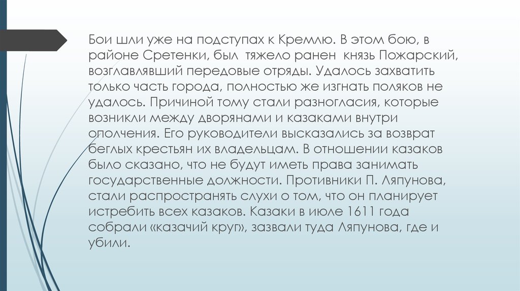 Бои шли уже на подступах к Кремлю. В этом бою, врайоне Сретенки, был тяжело ранен князь Пожарский,