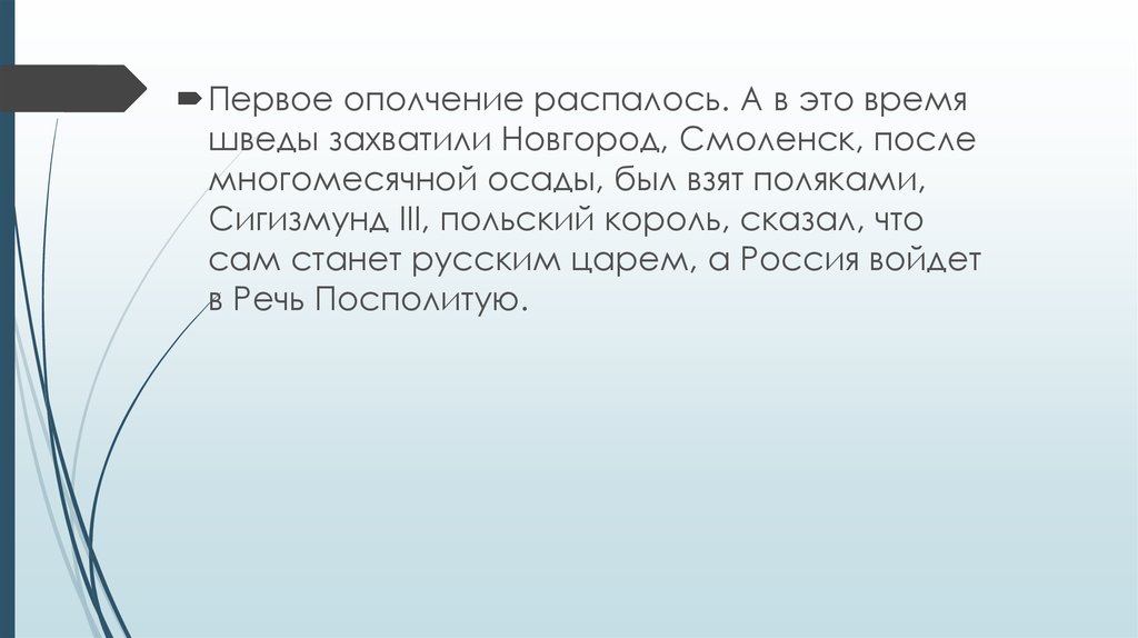 Первое ополчение распалось. А в это времяшведы захватили Новгород, Смоленск, после