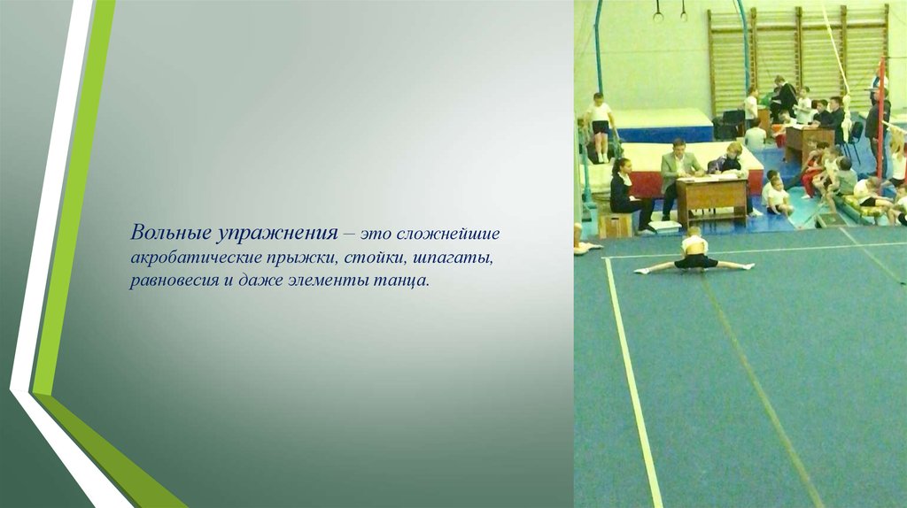 Вольные упражнения – это сложнейшиеакробатические прыжки, стойки, шпагаты,