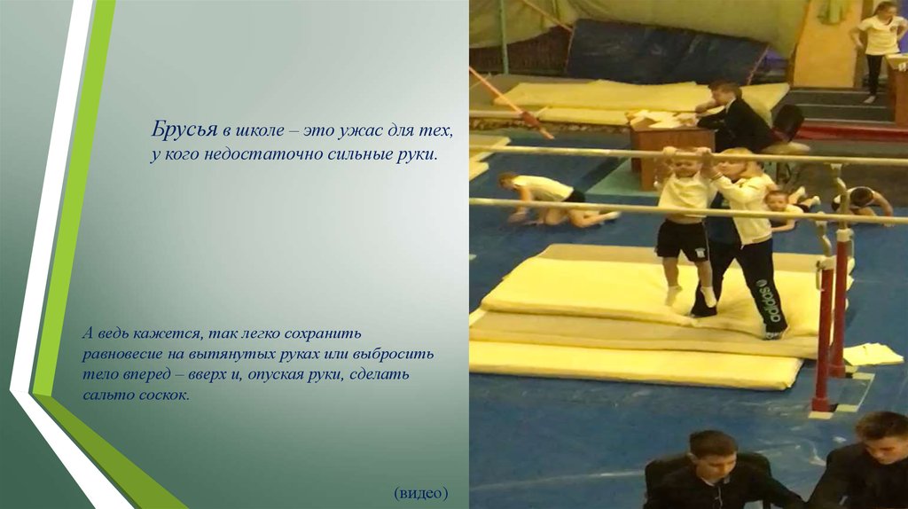 Брусья в школе – это ужас для тех,у кого недостаточно сильные руки.