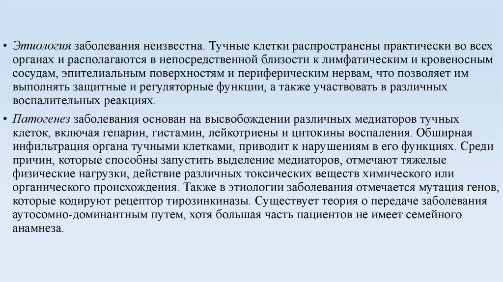 • Этиология заболевания неизвестна. Тучные клетки распространены практически во всехорганах и располагаются в непосредственной близости к лимфатическим и кровеносным