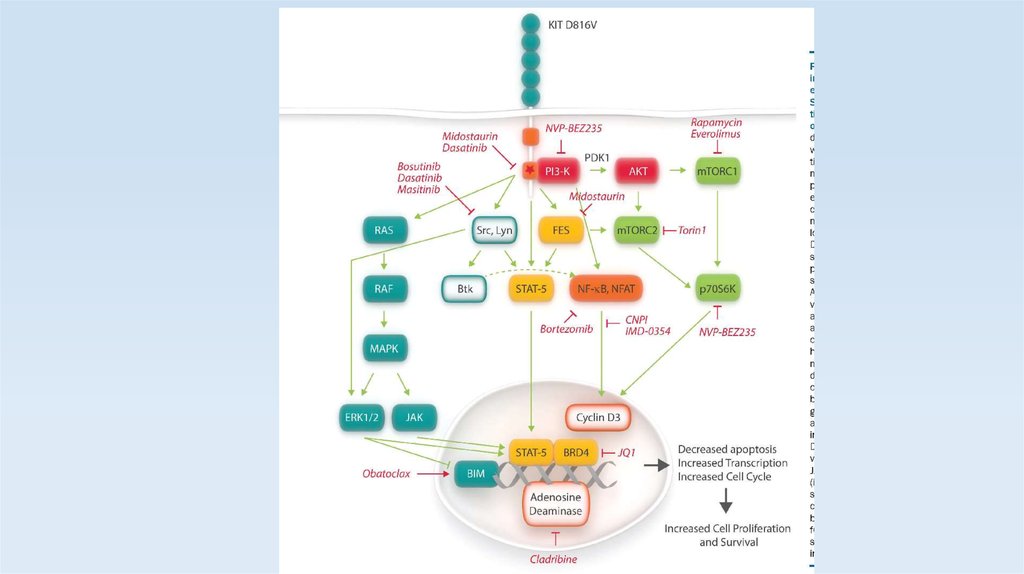 активирующие мутации в поверхностном рецепторе (c-kit) для фактора роста тучных клеток (SCF).