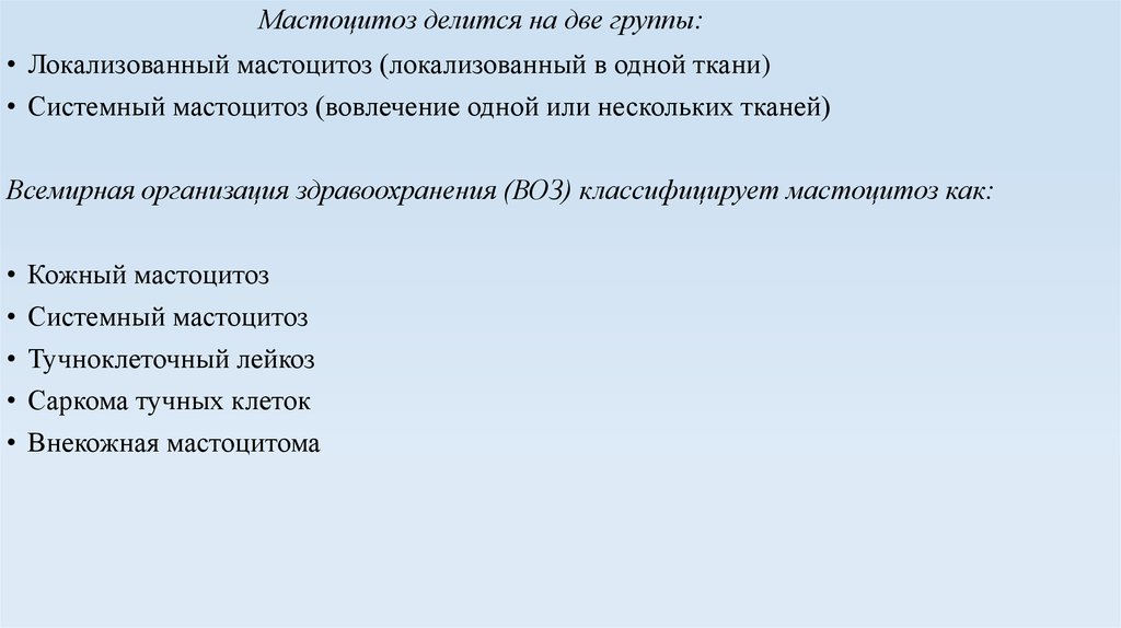 Мастоцитоз делится на две группы:• Локализованный мастоцитоз (локализованный в одной ткани)