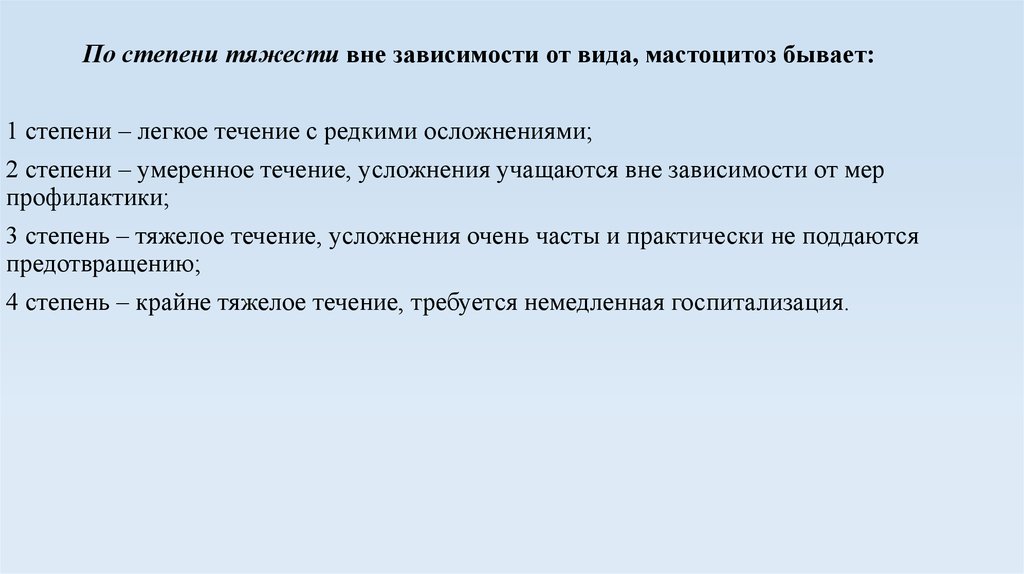 По степени тяжести вне зависимости от вида, мастоцитоз бывает:1 степени – легкое течение с редкими осложнениями;
