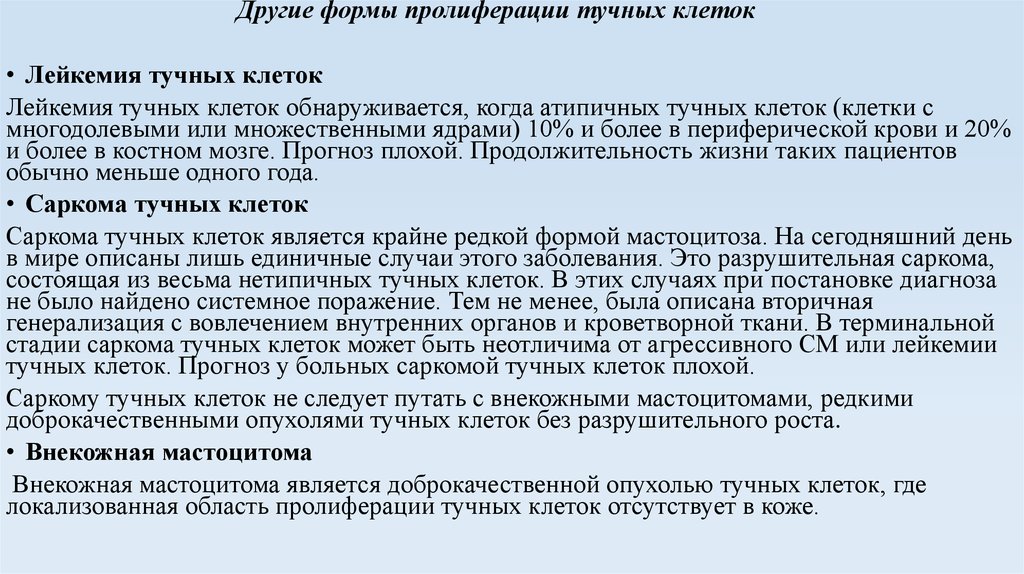 • Тучноклеточная лейкемия - злокачественная форма мастоцитоза, которая обусловлена