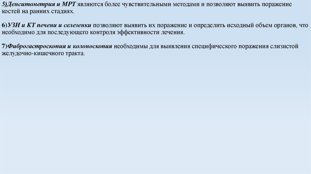 5)Денситометрия и МРТ являются более чувствительными методами и позволяют выявить поражениекостей на ранних стадиях.