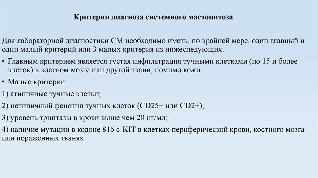 Критерии диагноза системного мастоцитозаДля лабораторной диагностики СМ необходимо иметь, по крайней мере, один главный и