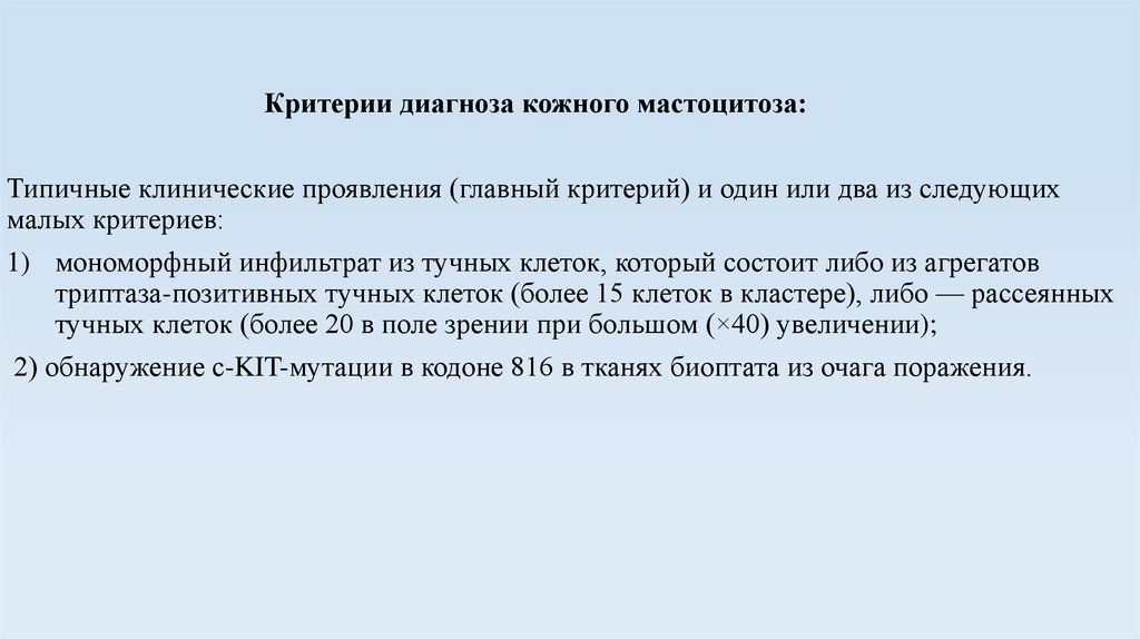 Критерии диагноза кожного мастоцитоза:Типичные клинические проявления (главный критерий) и один или два из следующих