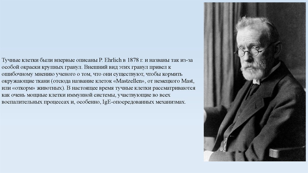 Тучные клетки были впервые описаны P. Ehrlich в 1878 г. и названы так из-заособой окраски крупных гранул. Внешний вид этих гранул привел к