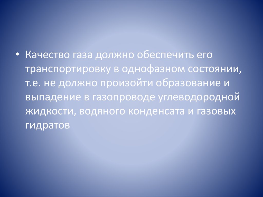 • Качество газа должно обеспечить еготранспортировку в однофазном состоянии,