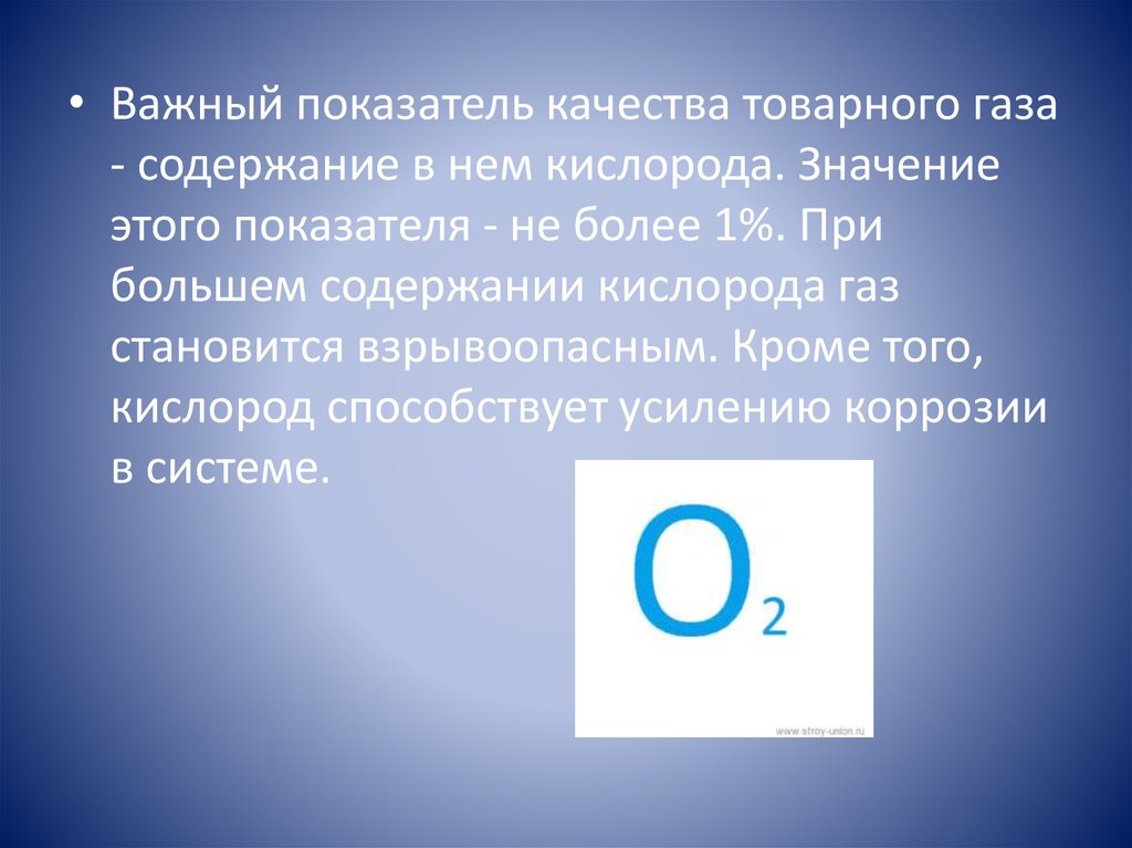 • Важный показатель качества товарного газа- содержание в нем кислорода. Значение