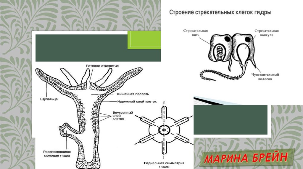 11. Соотнести позиции (по рисунку): 1. кишечная полость гидры 2. стрекательные клетки гидры