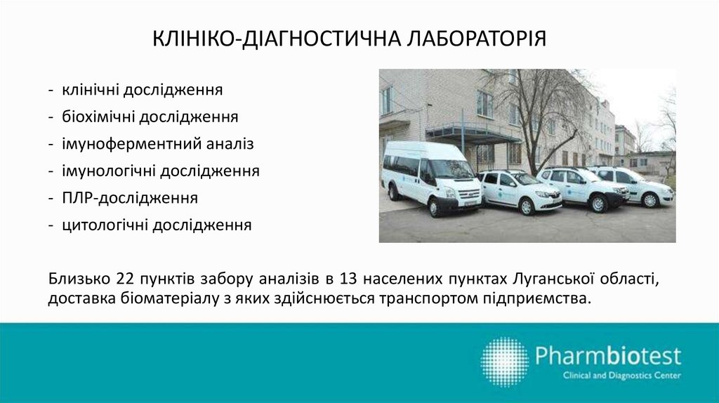 - клініко-діагностична лабораторія, яка виконує повний спектр лабораторних досліджень від загального аналізу