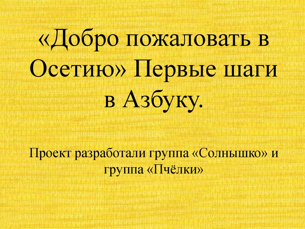 1. «Добро пожаловать в Осетию» Первые шаги в Азбуку. Проект разработали группа «Солнышко» и группа «Пчёлки»