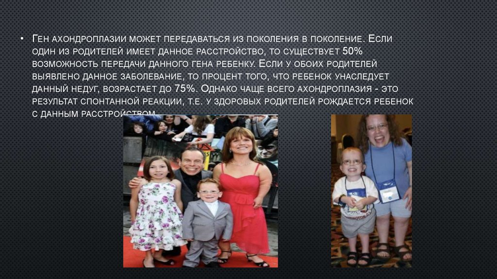 • ГЕН АХОНДРОПЛАЗИИ МОЖЕТ ПЕРЕДАВАТЬСЯ ИЗ ПОКОЛЕНИЯ В ПОКОЛЕНИЕ. ЕСЛИОДИН ИЗ РОДИТЕЛЕЙ ИМЕЕТ ДАННОЕ РАССТРОЙСТВО, ТО СУЩЕСТВУЕТ 50%