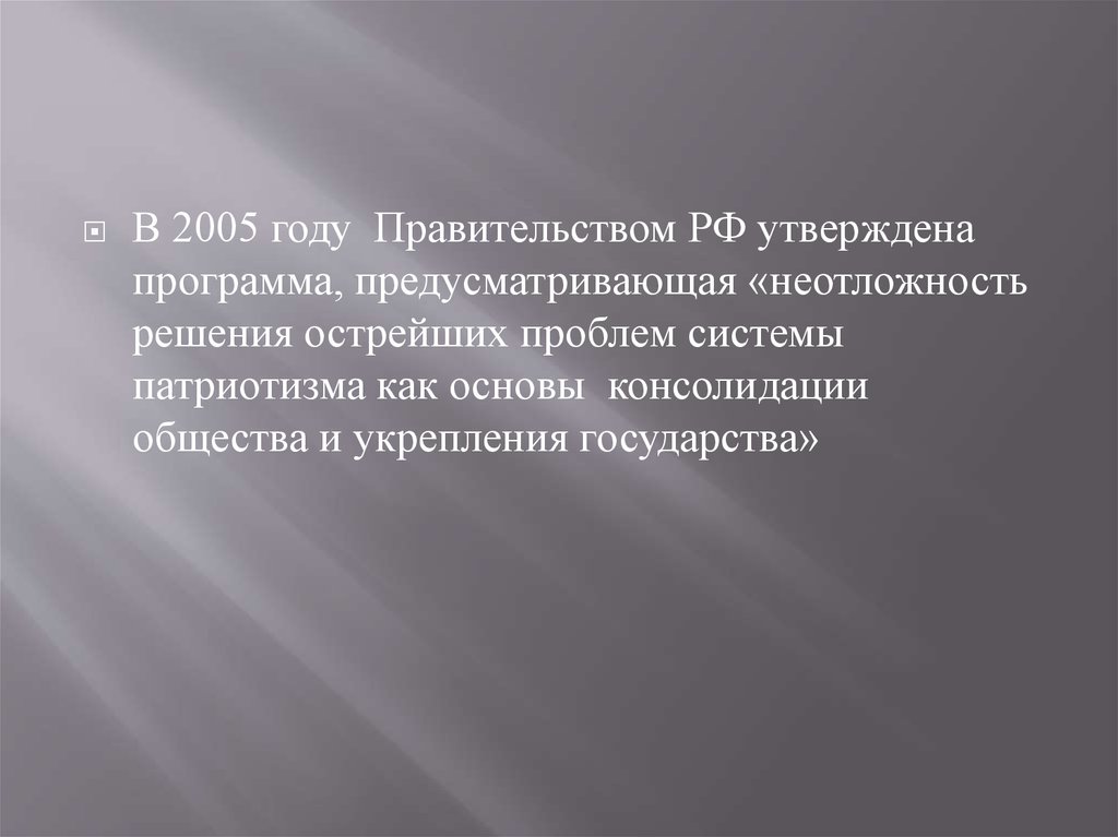 В 2005 году Правительством РФ утвержденапрограмма, предусматривающая «неотложность