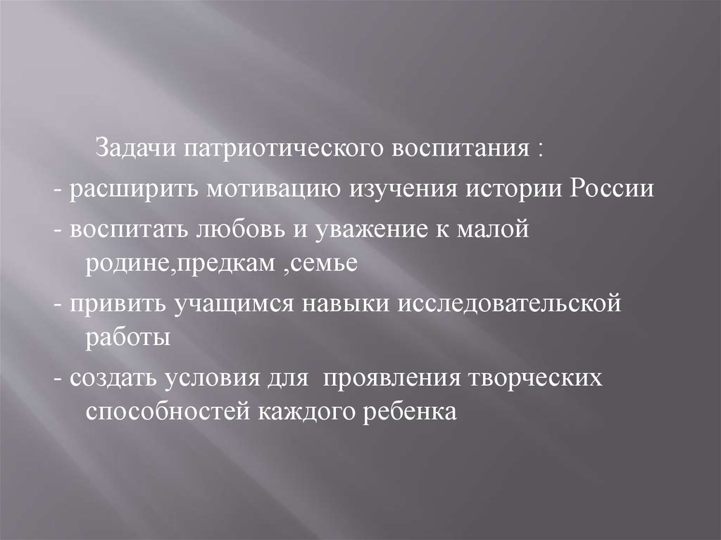 Задачи патриотического воспитания :- расширить мотивацию изучения истории России