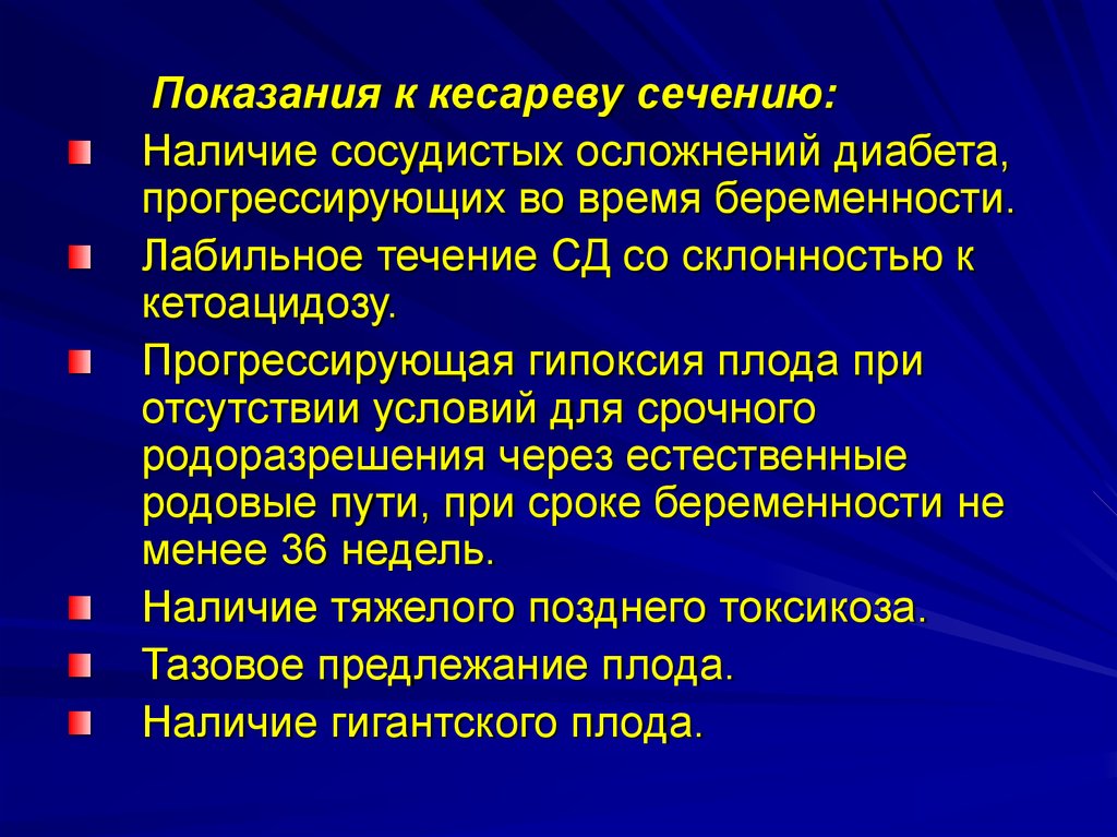 Показания к кесареву сечению:Наличие сосудистых осложнений диабета,