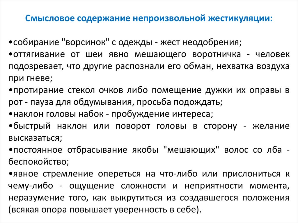 Смысловое содержание непроизвольной жестикуляции:•собирание "ворсинок" с одежды - жест неодобрения;