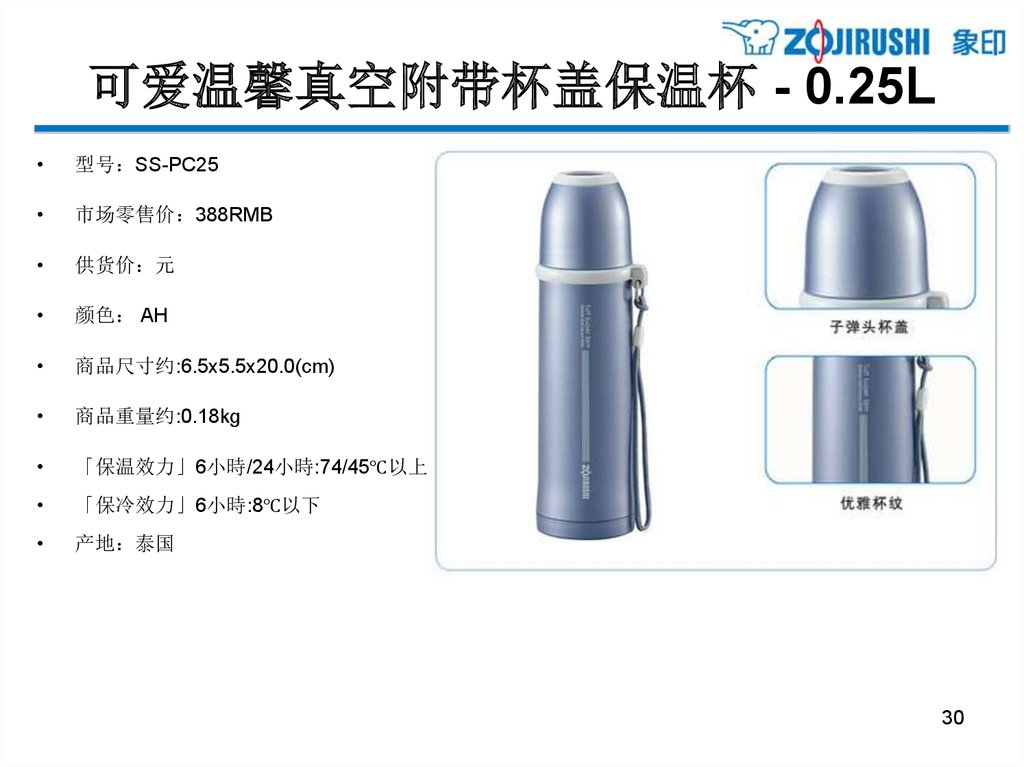 亲和更体贴的单手式不锈钢保温杯 - 0.3L型号 SM-PB30