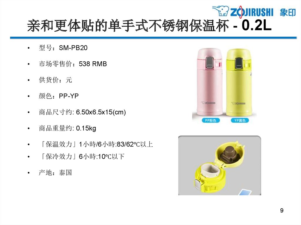 亲和更体贴的单手式不锈钢保温杯 - 0.2L型号 SM-PB20