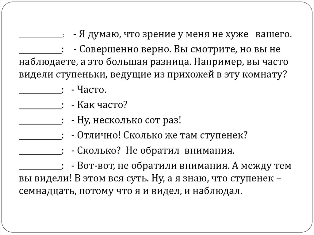 - Я думаю, что зрение у меня не хуже вашего.___________: - Совершенно верно. Вы смотрите, но вы не