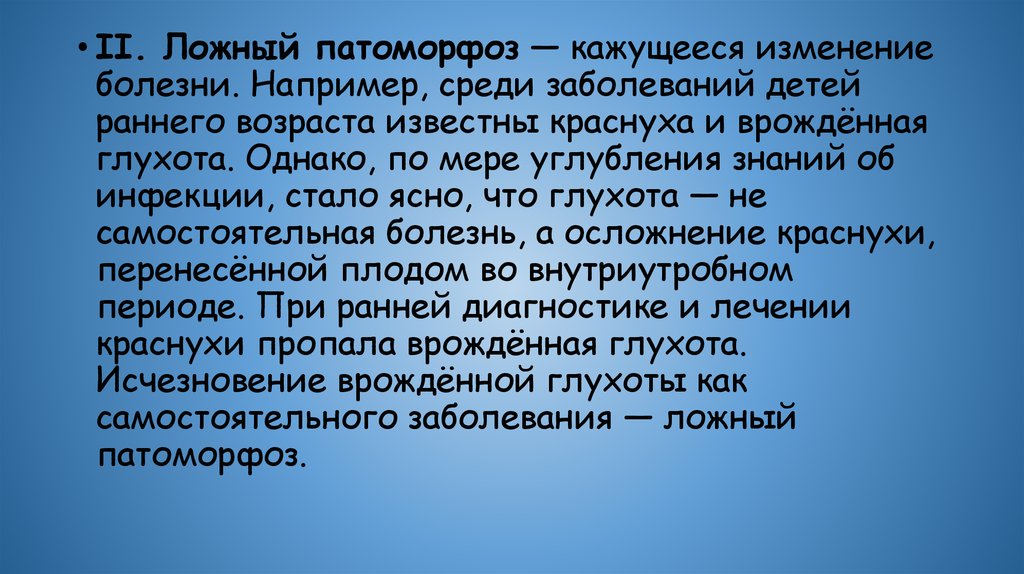 • II. Ложный патоморфоз — кажущееся изменениеболезни. Например, среди заболеваний детей