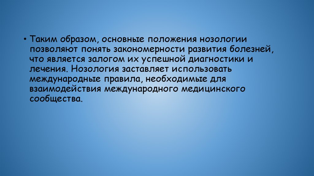 • Таким образом, основные положения нозологиипозволяют понять закономерности развития болезней,