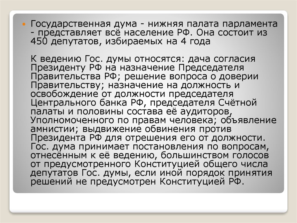 Государственная дума - нижняя палата парламента- представляет всё население РФ. Она состоит из