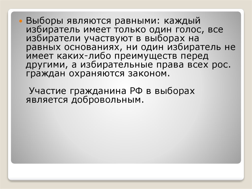 Выборы являются равными: каждыйизбиратель имеет только один голос, все