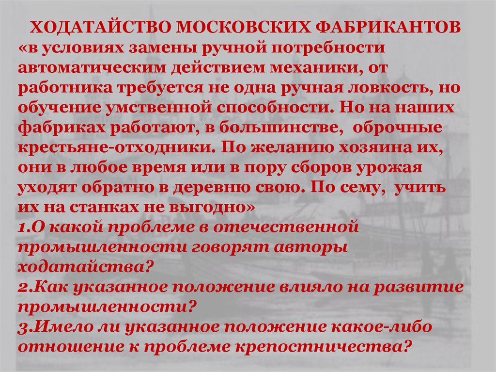 ХОДАТАЙСТВО МОСКОВСКИХ ФАБРИКАНТОВ«в условиях замены ручной потребности
