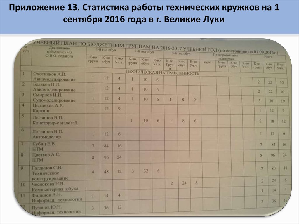 Приложение 12. Статистика работы технических кружков на 90е годы ХХ века в г. Великие Луки11.