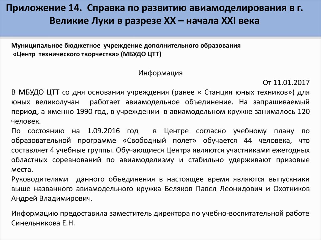 Приложение 14. Справка по развитию авиамоделирования в г.Великие Луки в разрезе ХХ – начала ХХI века