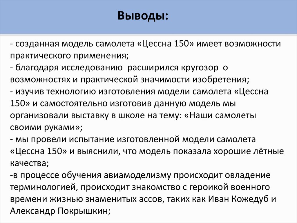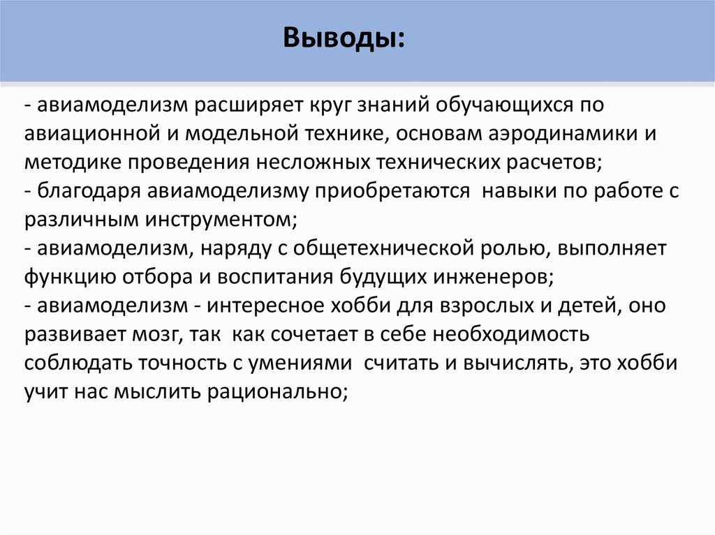 Выводы:- авиамоделизм расширяет круг знаний обучающихся по